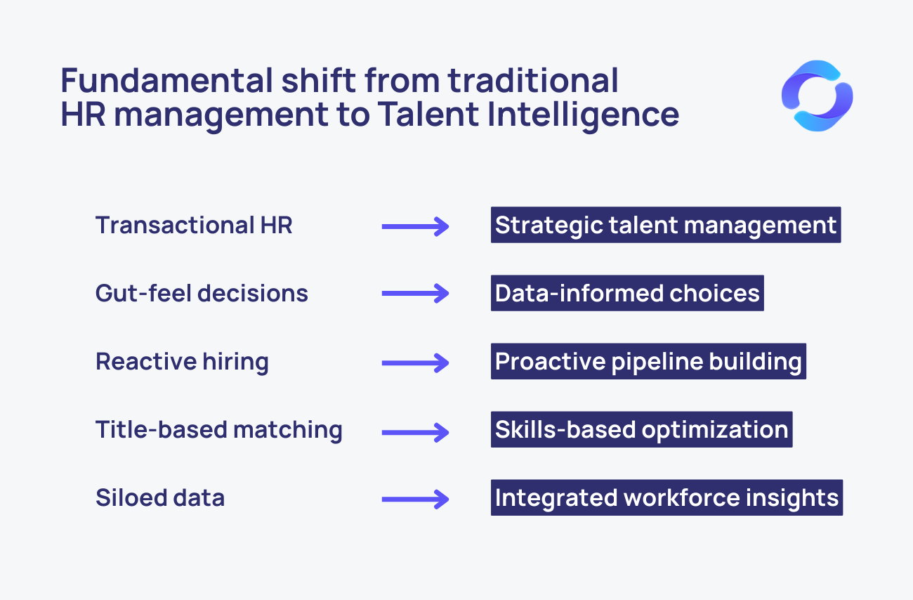 Talent intelligence marks a shift from intuition-based decisions to data-driven insights on people’s abilities. Unlike traditional HR, which centers on job titles and tenure, talent intelligence platforms assess skills, competencies, and potential. This gives real-time insights into employees’ actual abilities, not just their job descriptions.