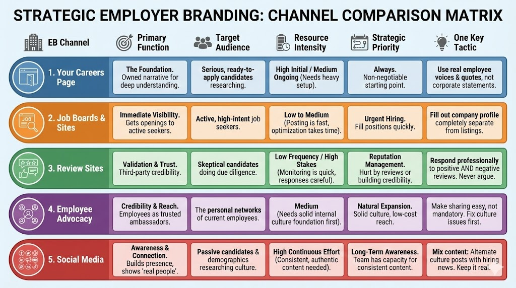 Each employer branding channel serves different purposes. Understanding what each does well helps you allocate resources effectively instead of spreading yourself thin.