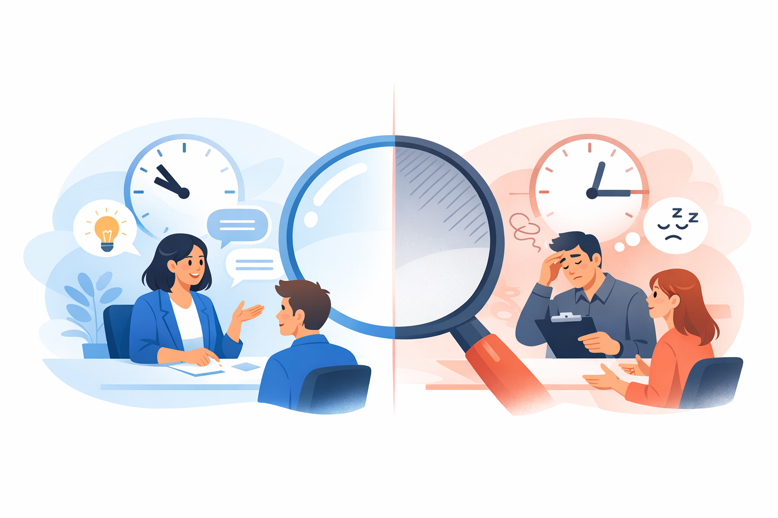 She was behind on emails. Had a meeting in 20 minutes. Mentally checked out. She asked the core questions but didn't probe further. The interview lasted 25 minutes.