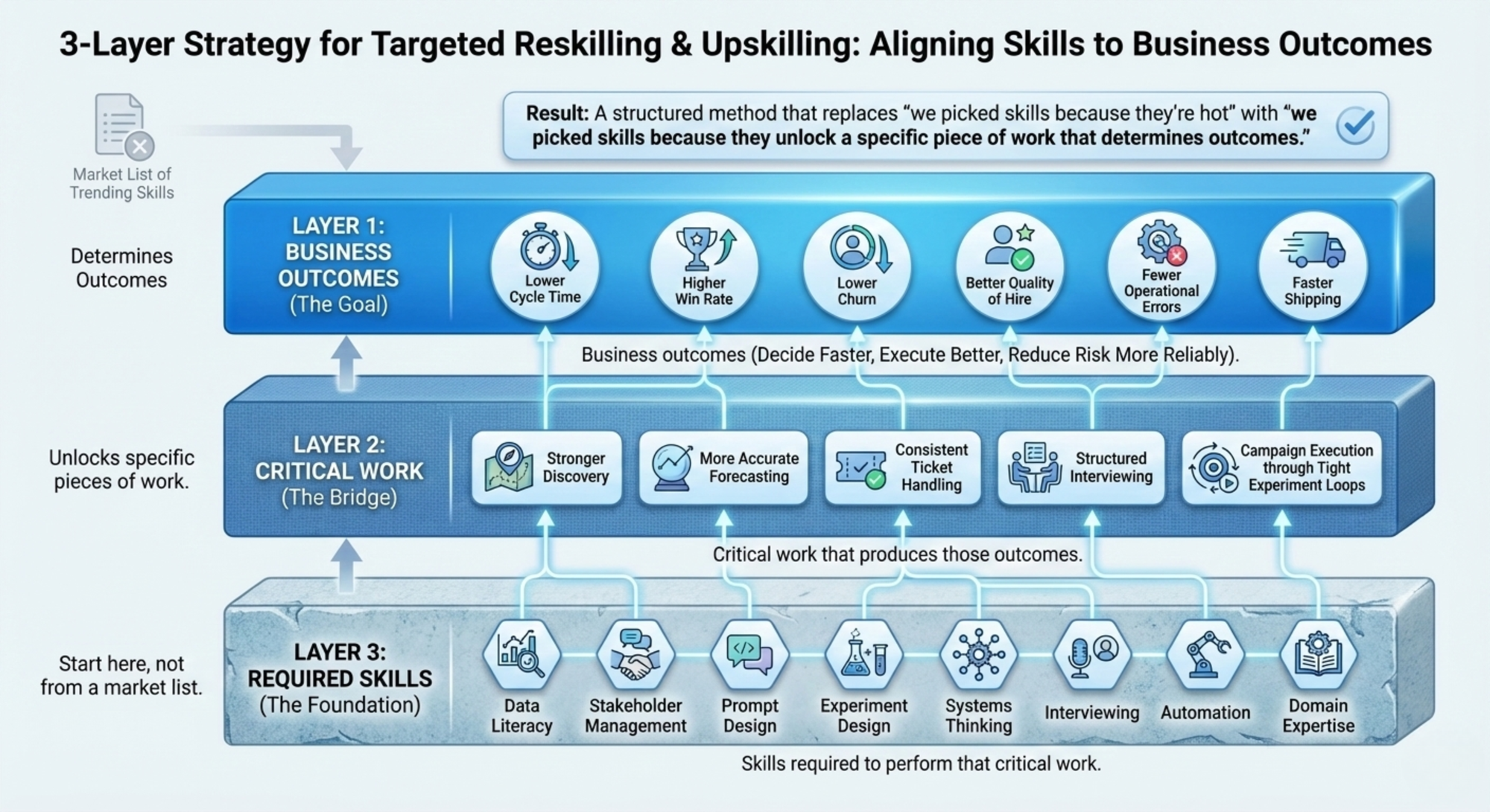 This three-layer method prevents “we picked skills because they’re hot,” and replaces it with “we picked skills because they unlock a specific piece of work that determines outcomes.”