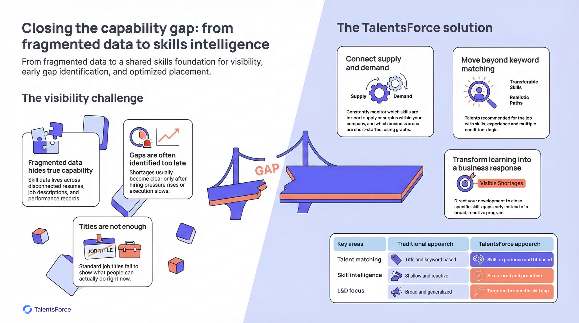 TalentsForce helps organizations identify skills gaps earlier by comparing skill demand and workforce supply in one view, so learning and workforce planning teams can act with more confidence.
